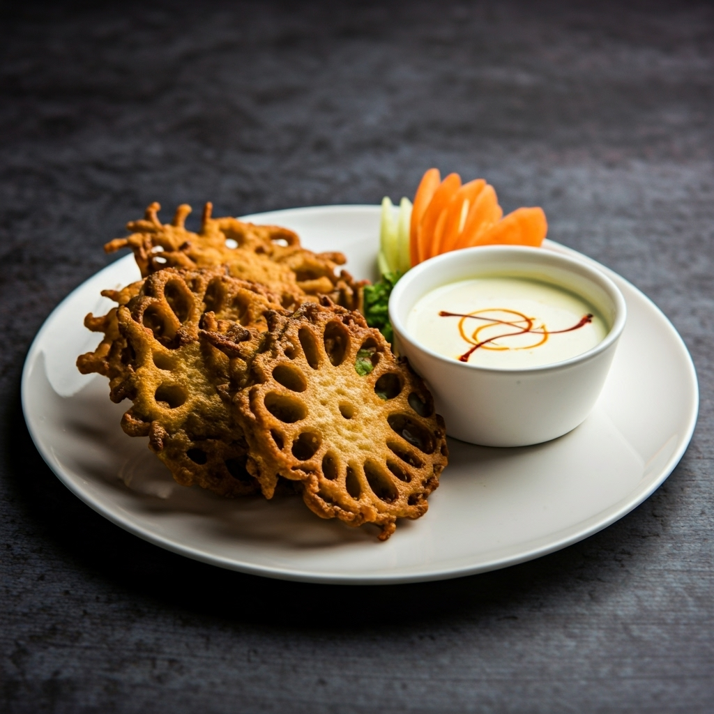 Kashmiri Nadru Monje: Crispy Lotus Stem Fritters with saffron-yogurt dip – INR 150. A delightful start to your meal, offering a unique blend of textures and flavours.